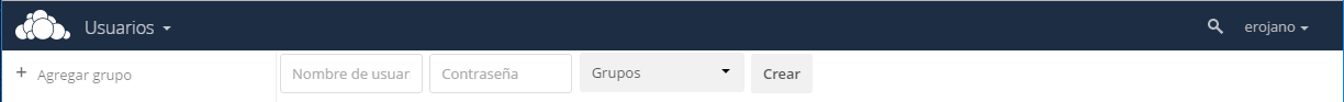 Ingrese al cliente WEB de su instancia ownCloud con su cuenta administrativa, y seleccione la opción Usuarios en el menú desplegable situado en el lado superior derecho.